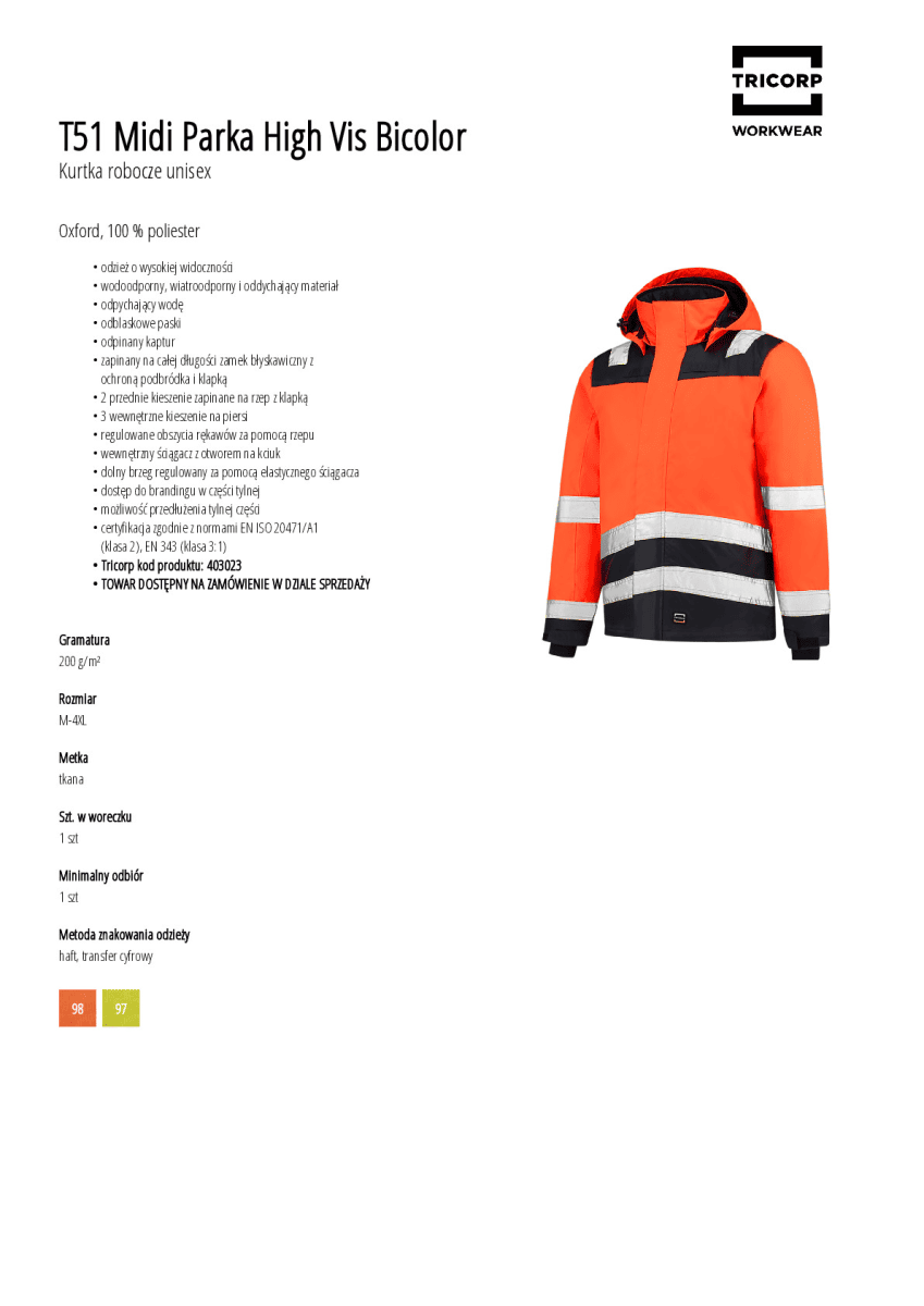 certyfikacja zgodnie z normami EN ISO 20471/A1 (klasa 2), EN 343 (klasa 3:1)
